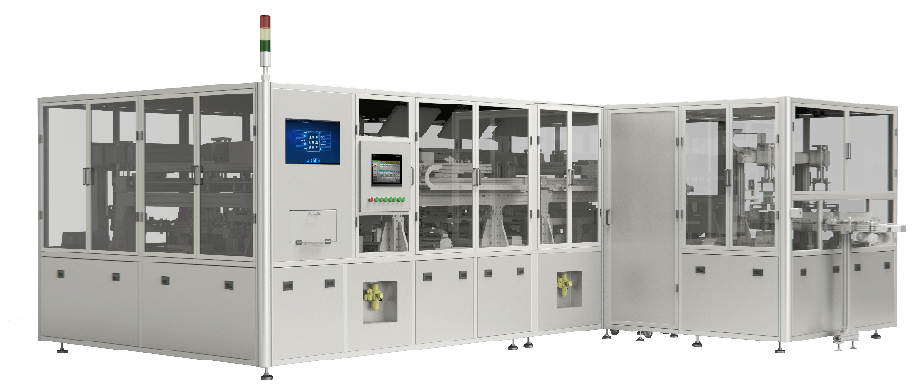 用于实现方形铝壳锂电池的表面清洁、重量测量、尺寸测量、外观检测、贴码及贴标检测、NG筛选等功能,且将生产数据本地存储及上传 MES 系统,为全自动连线设备。